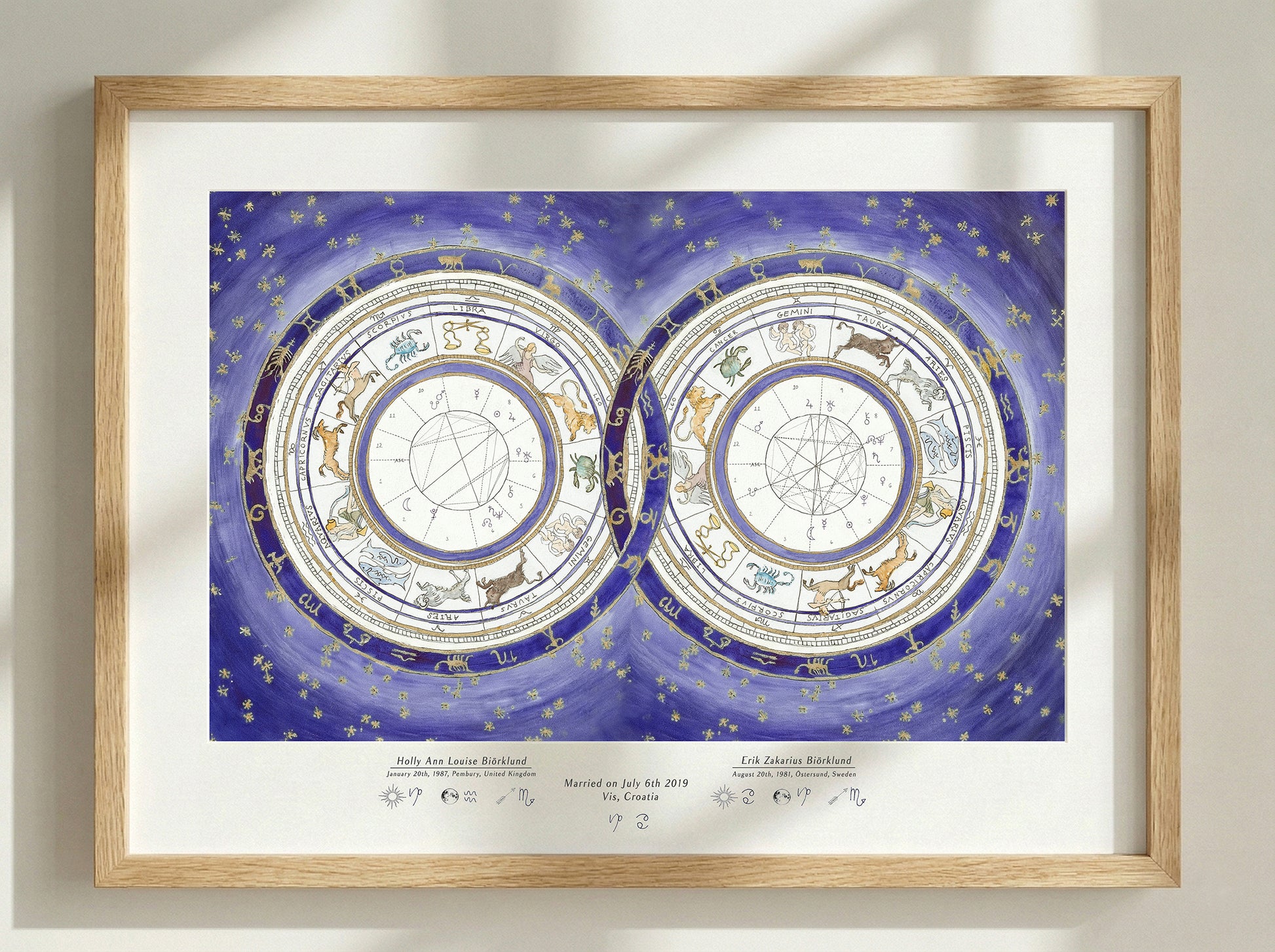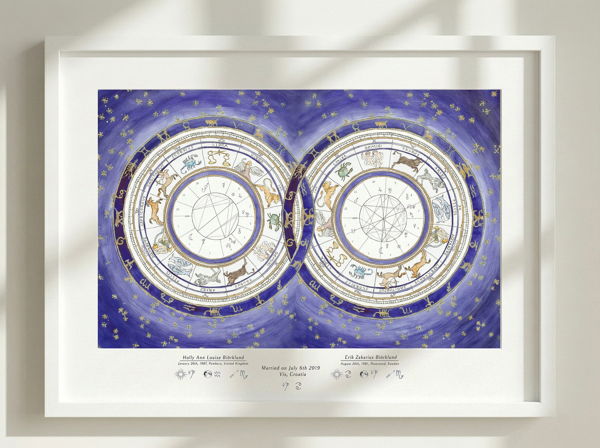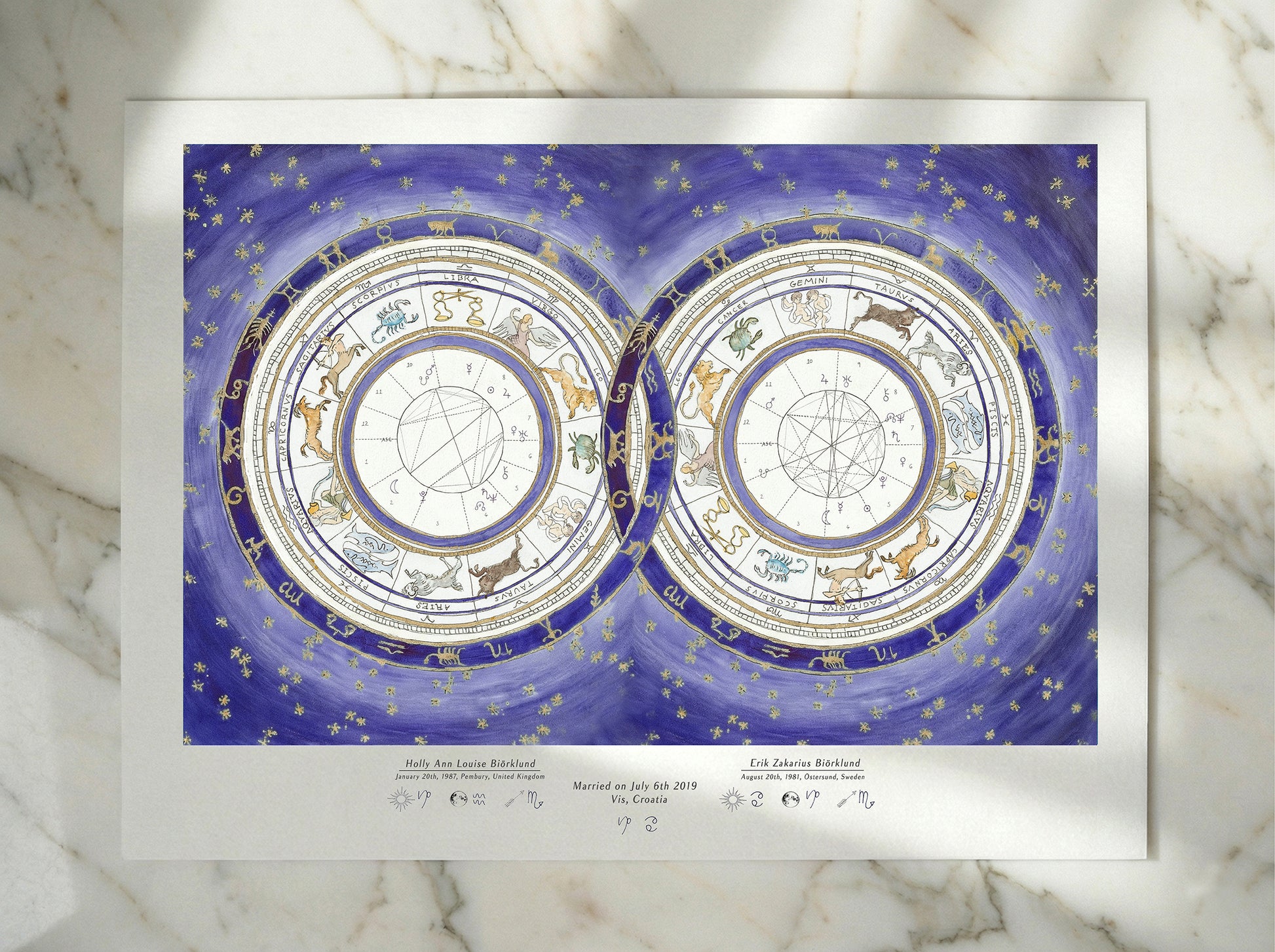 Custom Astrological Wedding Chart, printed on textured, archival quality, Hahnemühle German Etching paper. This artwork features a unique design where the couple's individual astrological birth charts are beautifully interlocked. It represents the positions of the planets and signs of the zodiac at the exact moments of your births, creating a visual map of your cosmic union. A perfect commemoration for a wedding, engagement, or anniversary—a talisman celebrating the magical relationship between two souls.