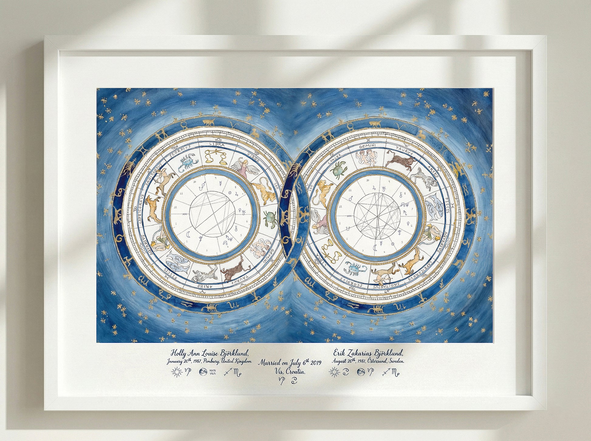 This piece serves as a visual blueprint of your cosmic union. I map the precise positions of the planets and zodiac signs at the exact moments of your births to create a unique portrait of your astrological birth charts- celebrating the bond between two souls—perfect for a wedding, engagement, or anniversary heirloom.
