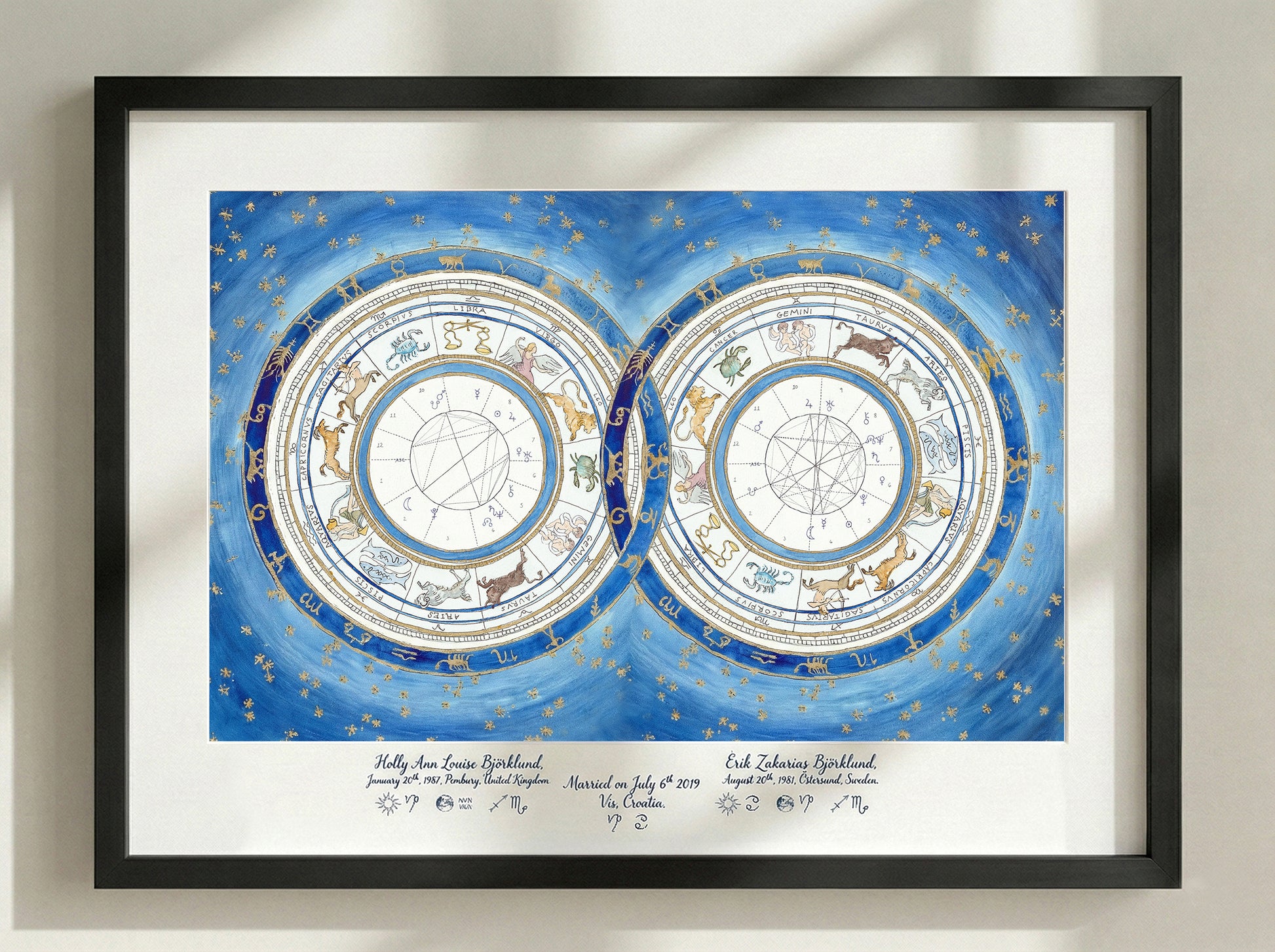 This piece serves as a visual blueprint of your cosmic union. I map the precise positions of the planets and zodiac signs at the exact moments of your births to create a unique portrait of your astrological birth charts- celebrating the bond between two souls—perfect for a wedding, engagement, or anniversary heirloom.