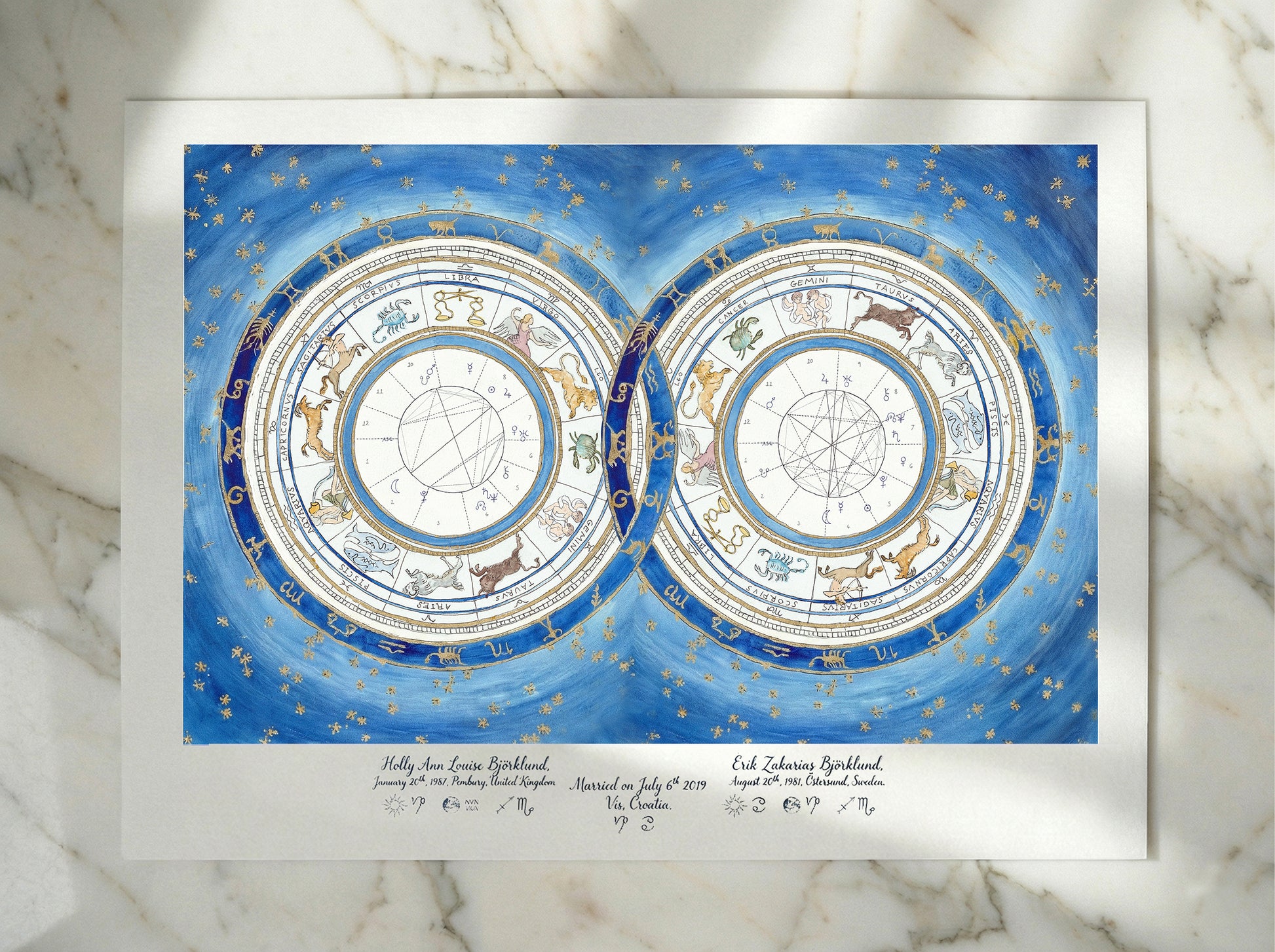 Working with watercolour, gouache, and gold leaf on heavyweight archival Hahnemühle German etching paper, I meticulously hand-draw and paint your individual astrological charts into a beautifully interlocked design.