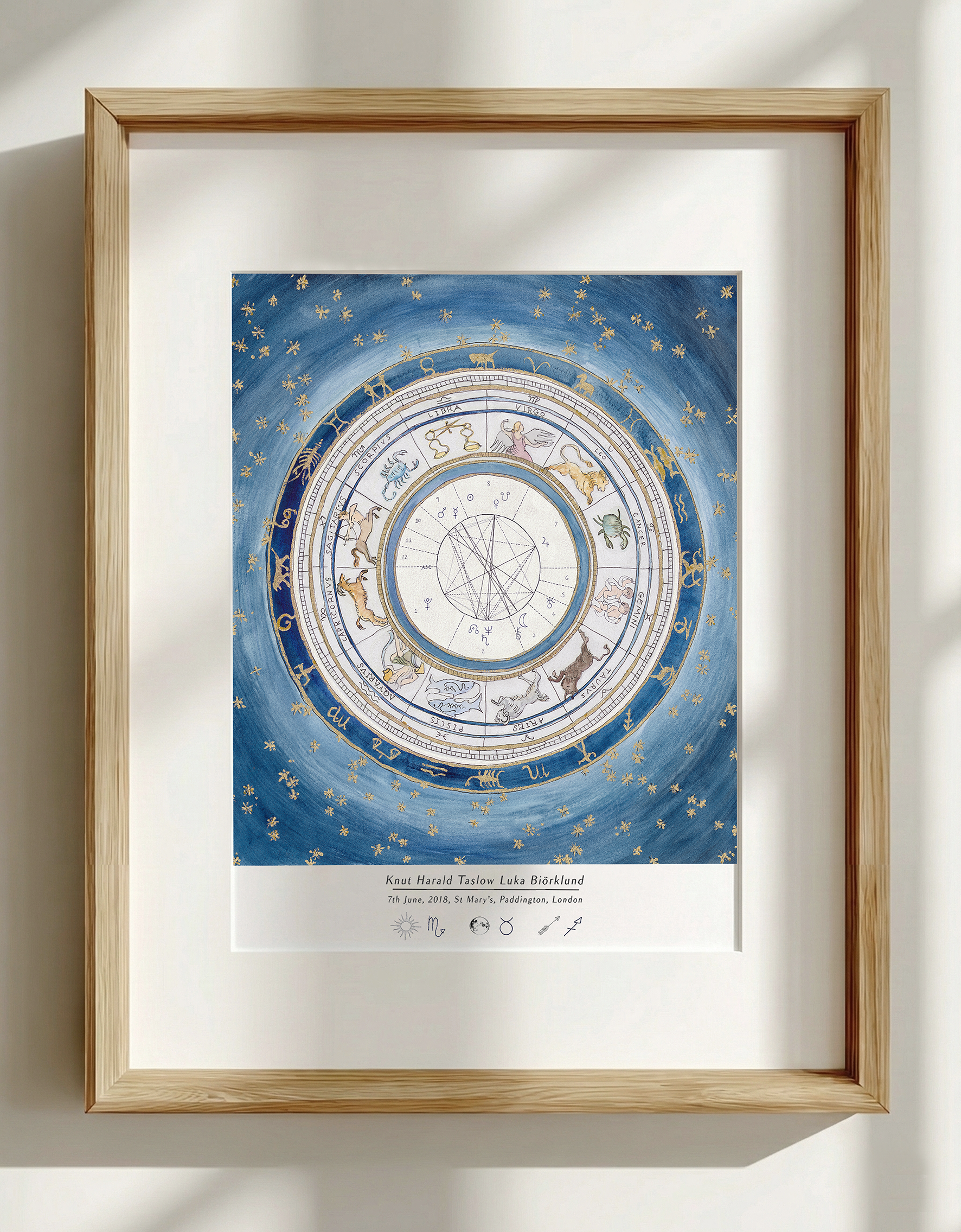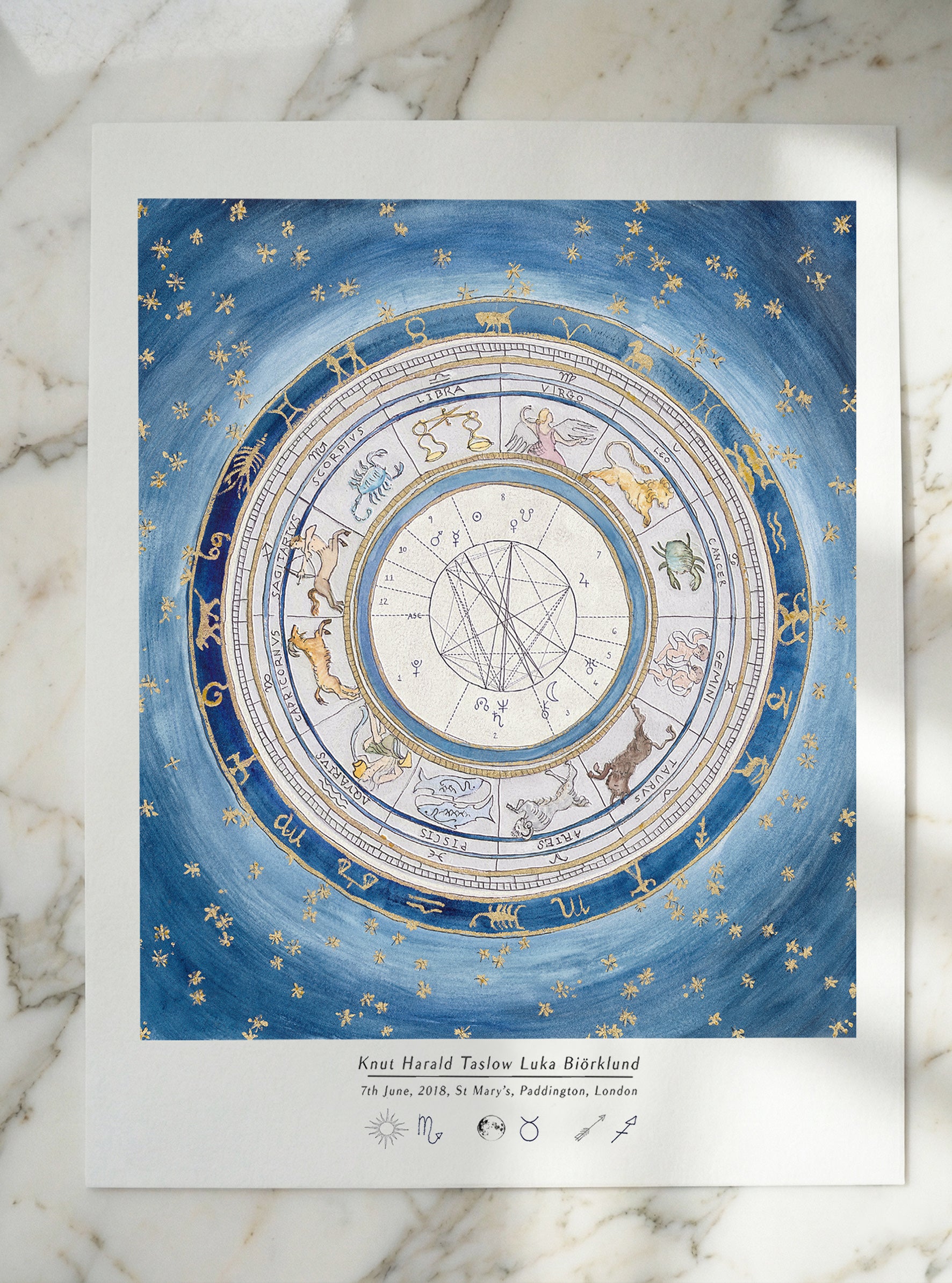 Custom Astrological Birth Chart, printed on textured, archival quality, Hahnemühle German Etching paper. Every chart is uniquely custom, representing the positions of the planets and signs of the zodiac at the exact moment of your birth, forming an image as unique as your fingerprint. A thoughtful gift for a loved one, or a beautiful gift for a new baby, a talisman celebrating our magical relationship between heaven and earth.