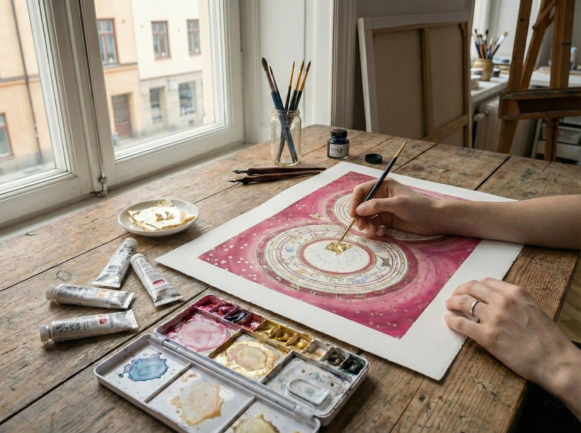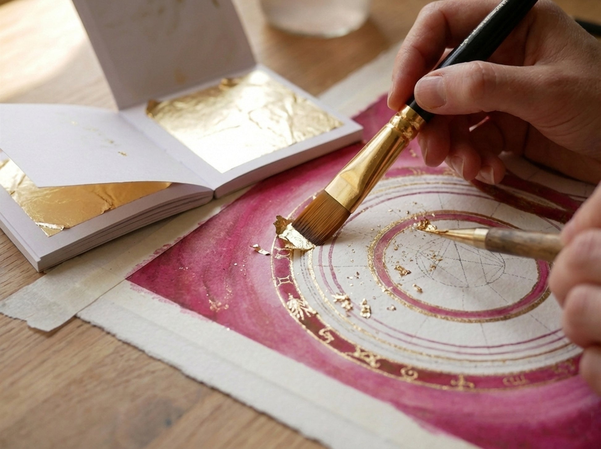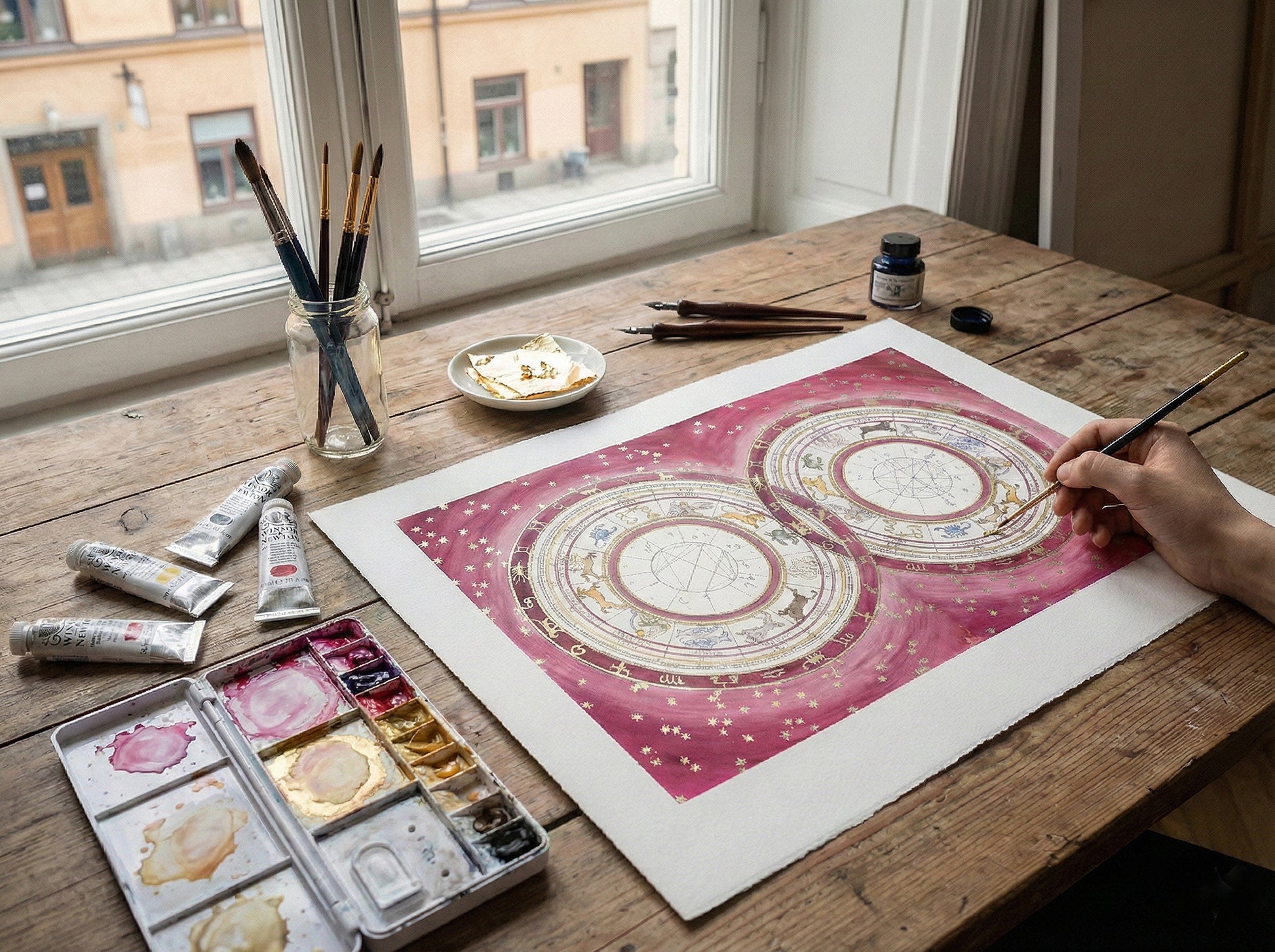 Working with watercolour, gouache, and gold leaf on heavyweight archival Hahnemühle German etching paper, I meticulously hand-draw and paint your individual astrological charts into a beautifully interlocked design.