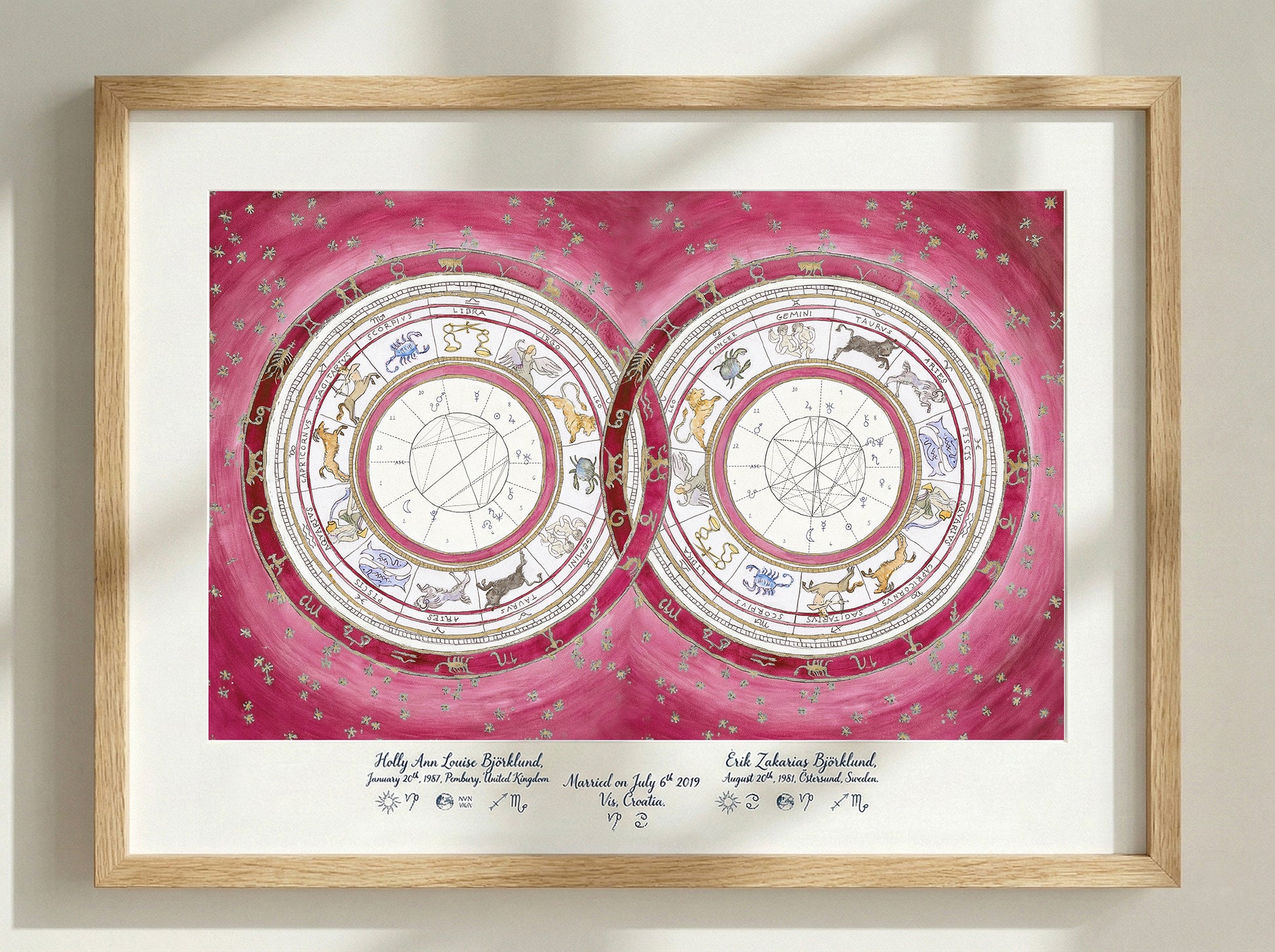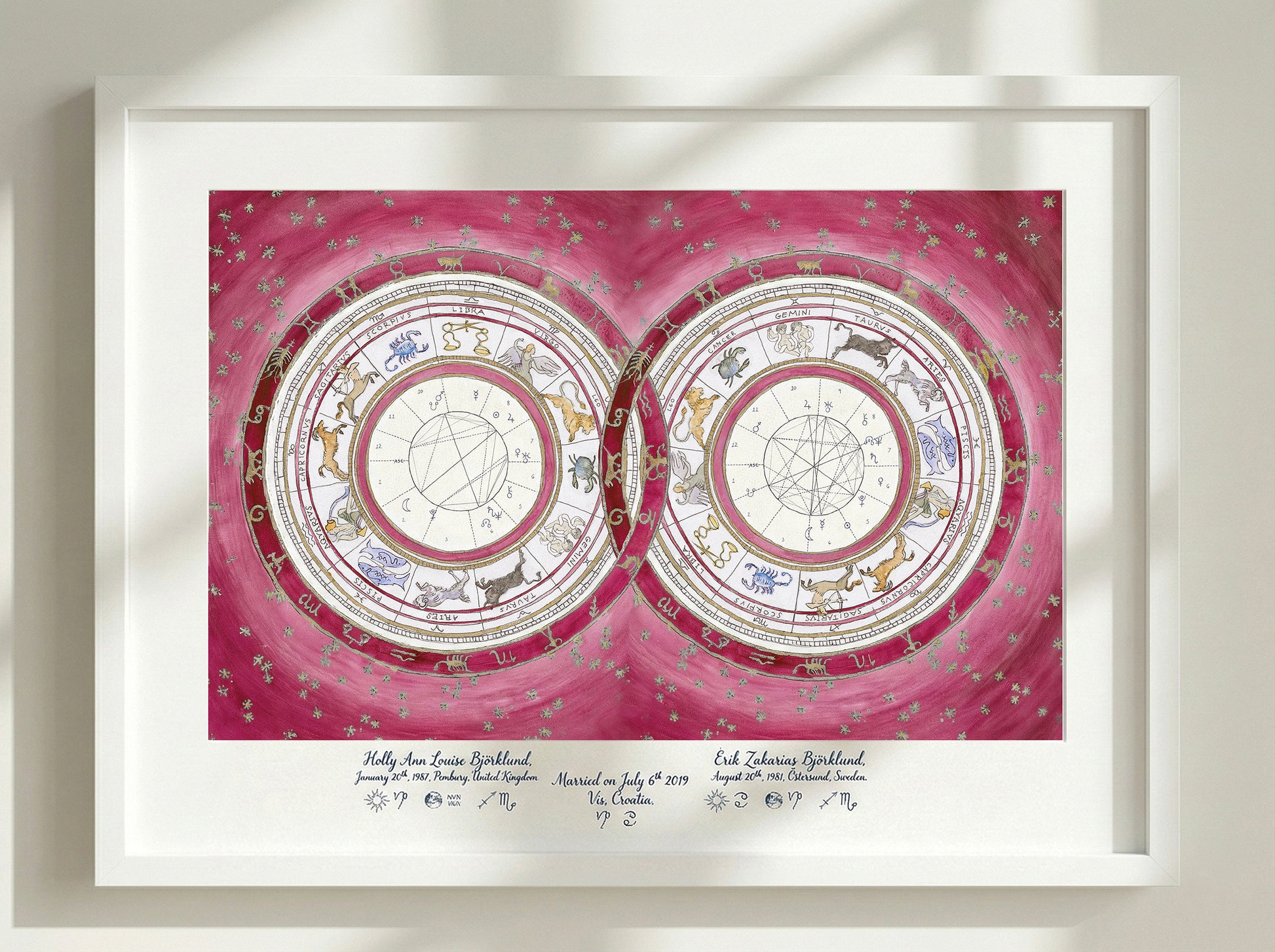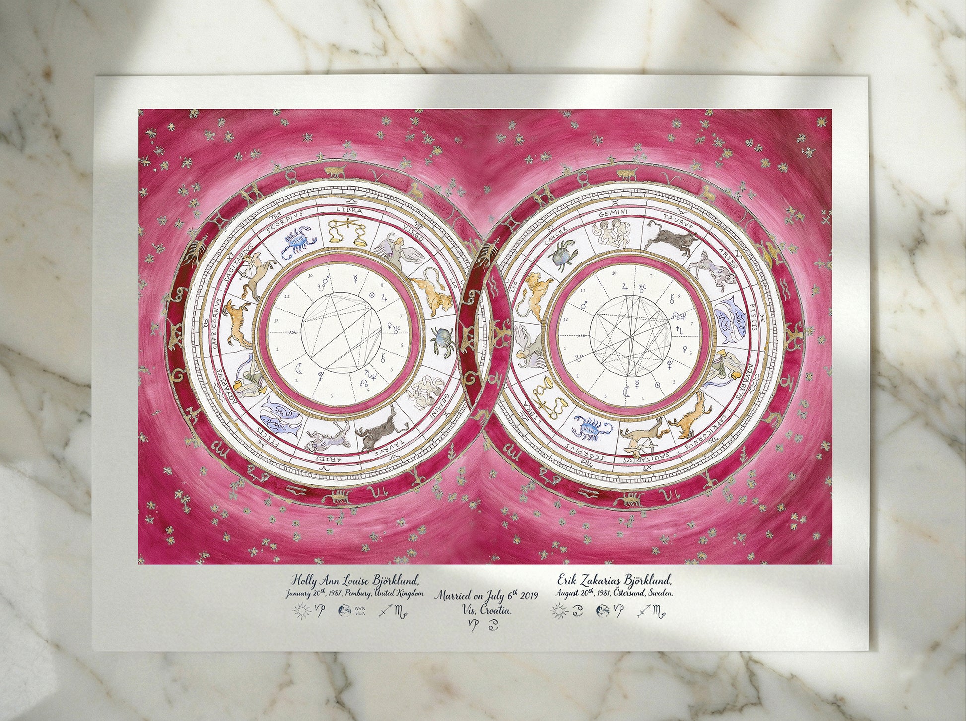 This piece serves as a visual blueprint of your cosmic union. I map the precise positions of the planets and zodiac signs at the exact moments of your births to create a unique portrait of your astrological birth charts- celebrating the bond between two souls—perfect for a wedding, engagement, or anniversary heirloom.