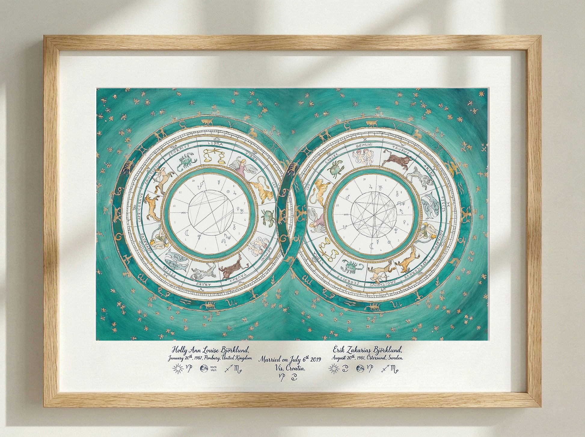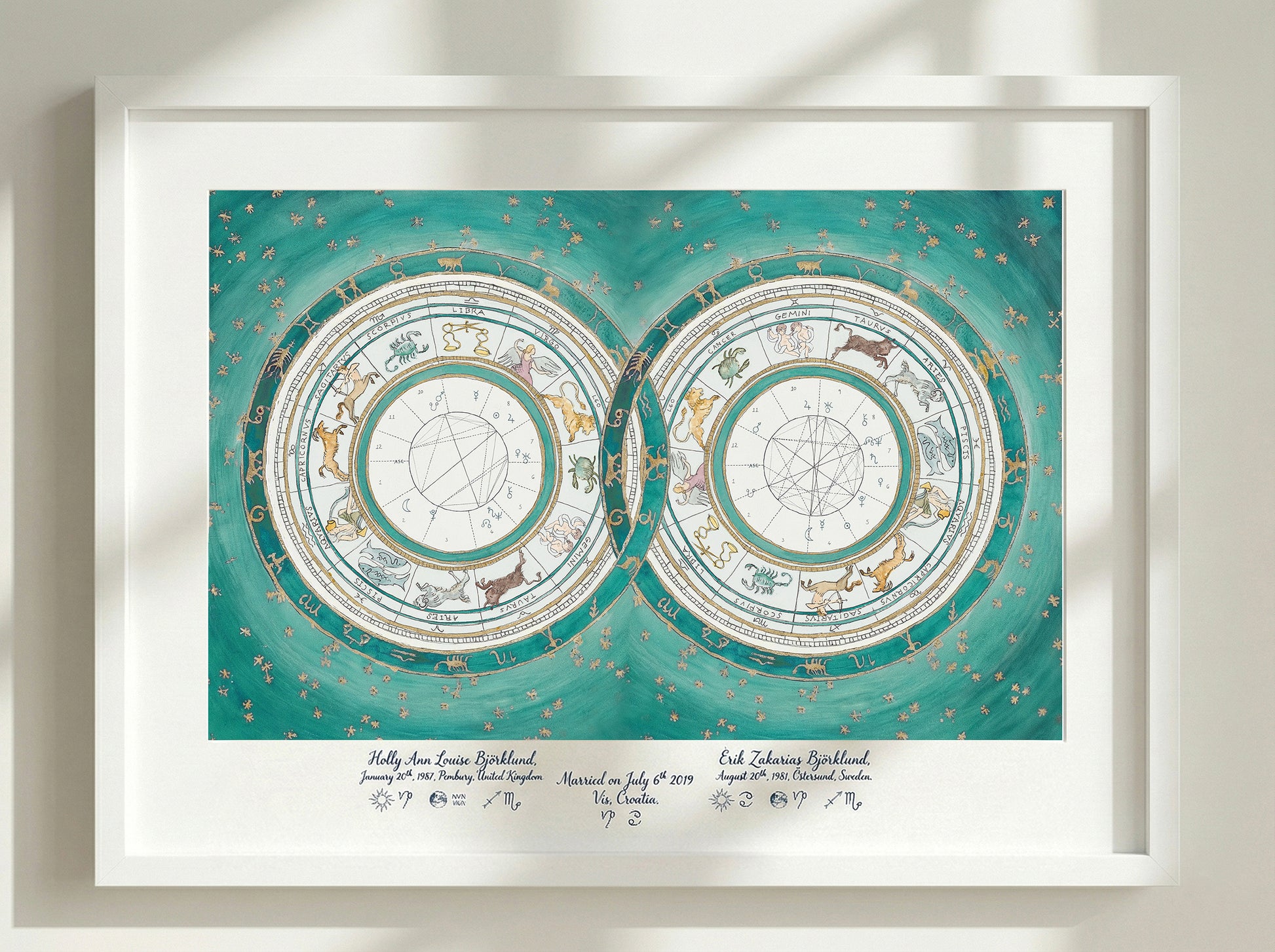This piece serves as a visual blueprint of your cosmic union. I map the precise positions of the planets and zodiac signs at the exact moments of your births to create a unique portrait of your astrological birth charts- celebrating the bond between two souls—perfect for a wedding, engagement, or anniversary heirloom.