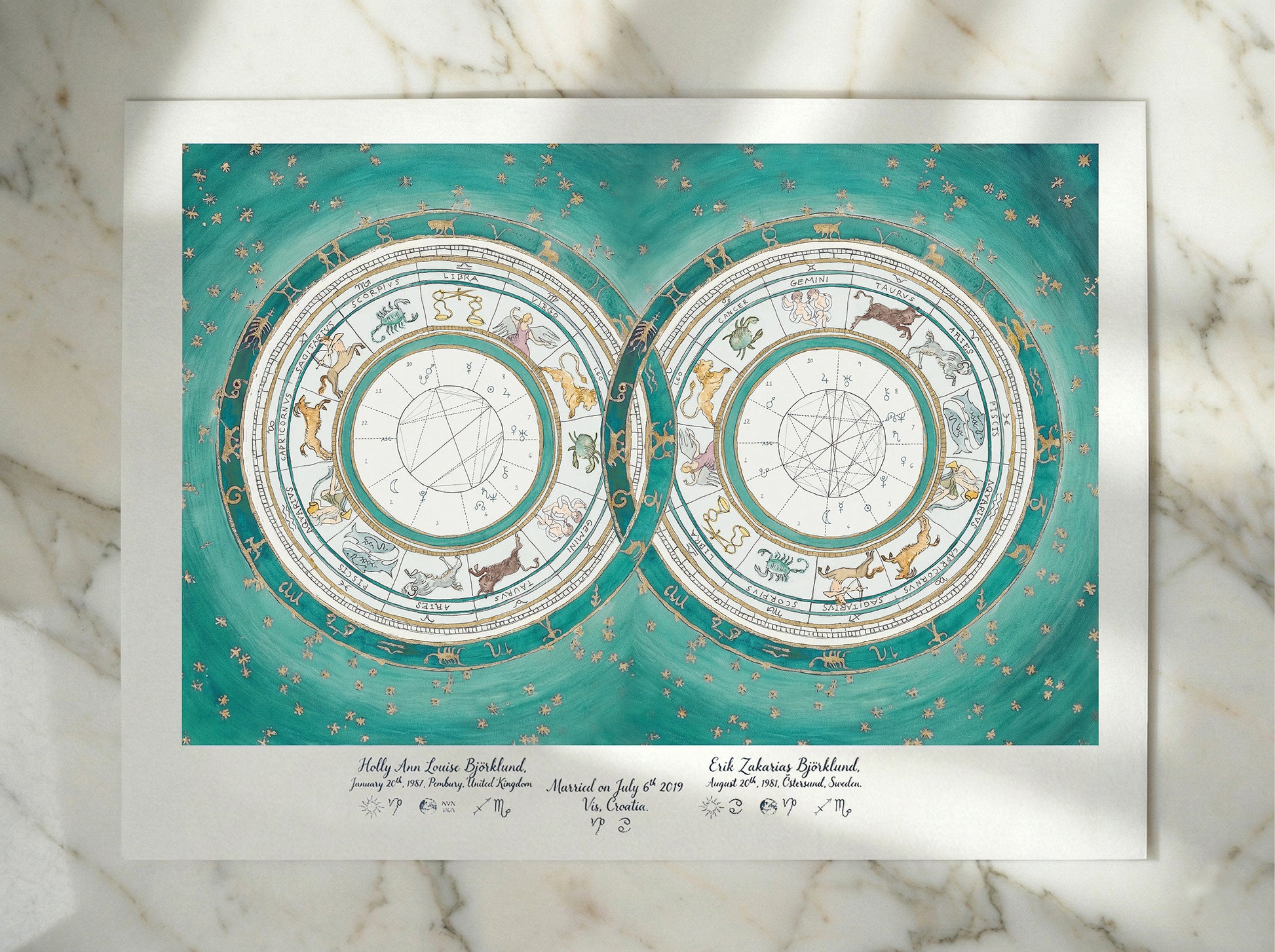 For the finishing touch, I hand-letter the details and astrological symbols in elegant calligraphy ink along the bottom edge.